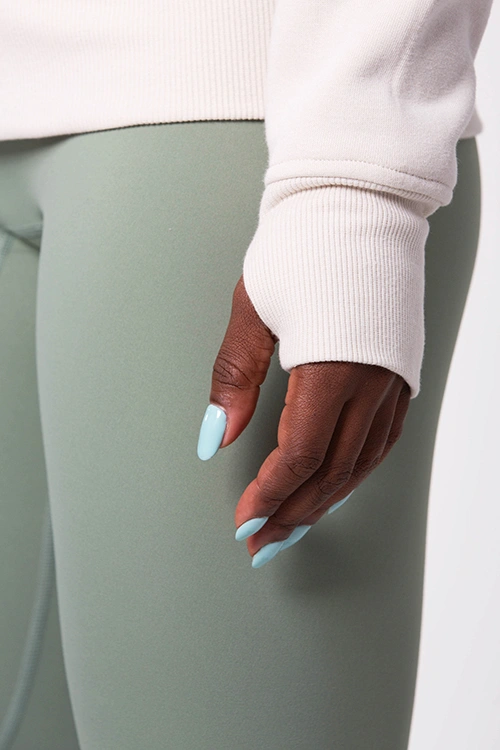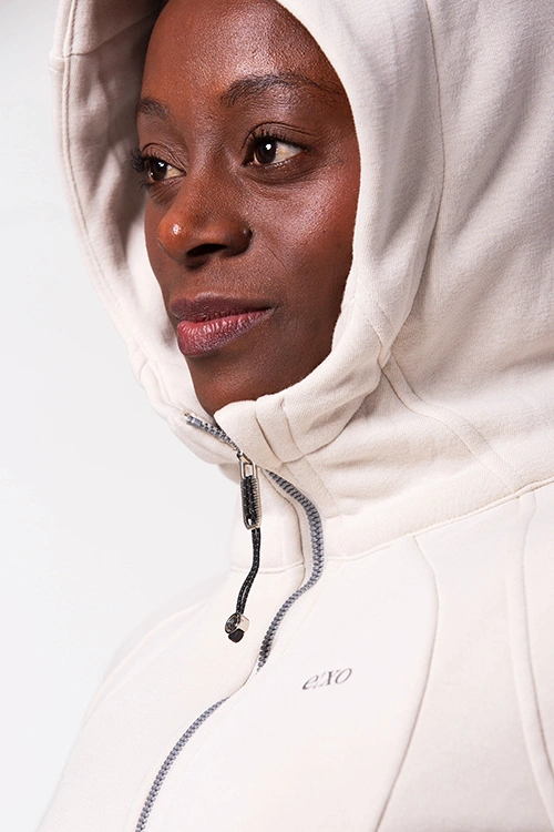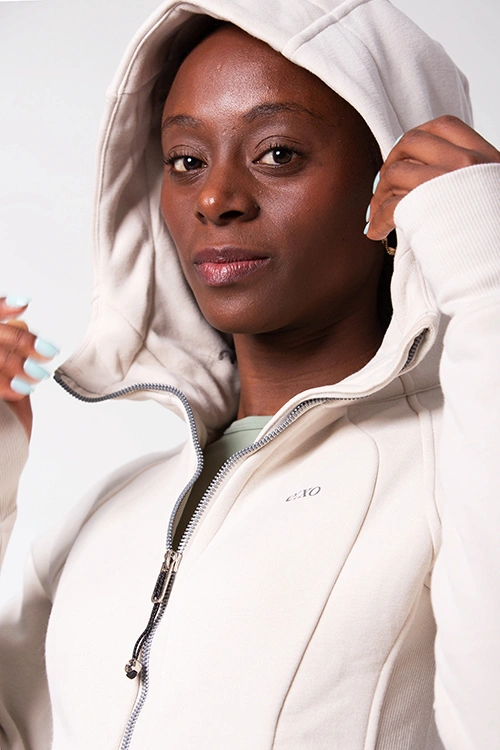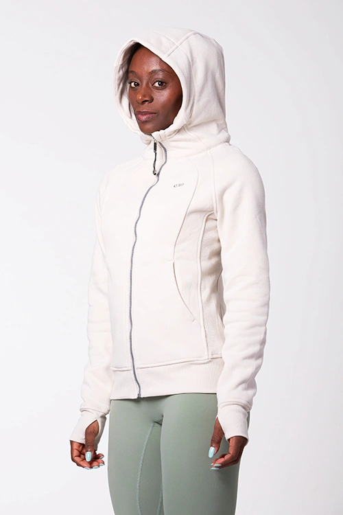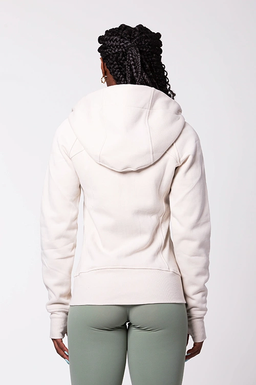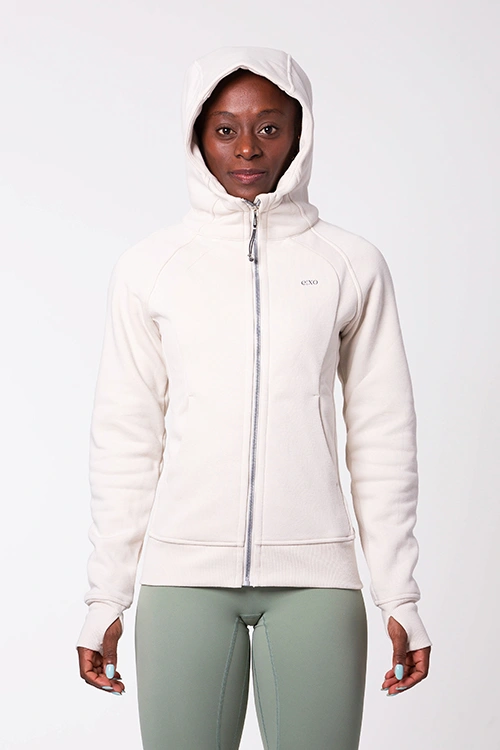 O Casaco Cozy Creme é o aliado perfeito para os dias de inverno. Confeccionado com uma mistura de 85% algodão, que proporciona conforto e respirabilidade, e 15% spandex, que garante elasticidade e um ajuste confortável, este casaco é tão funcional quanto elegante. O tecido grosso e resistente oferece máxima proteção contra o frio, enquanto o capuz amplo mantém o pescoço e as orelhas aquecidos. Inclui bolsos práticos e um detalhe nas mangas para encaixar o polegar, impedindo a entrada de frio pelas mãos. Os pormenores laterais tornam o design ainda mais ergonómico e confortável.