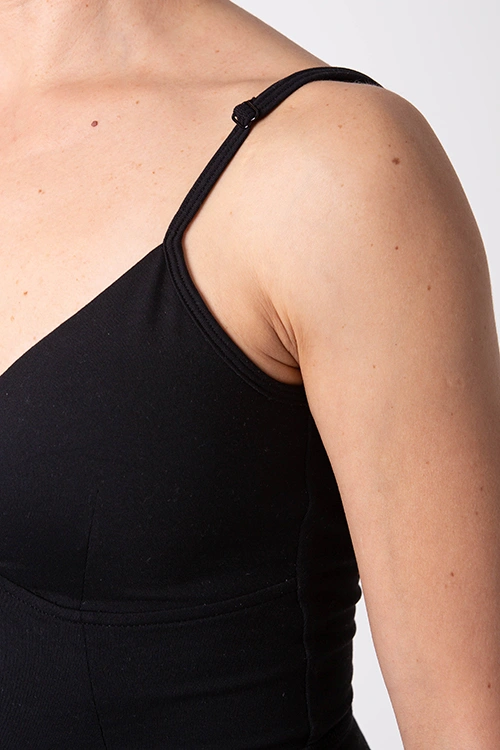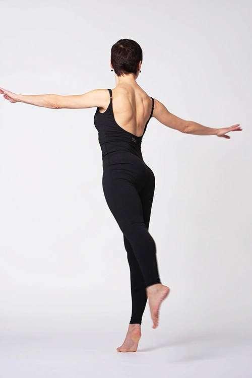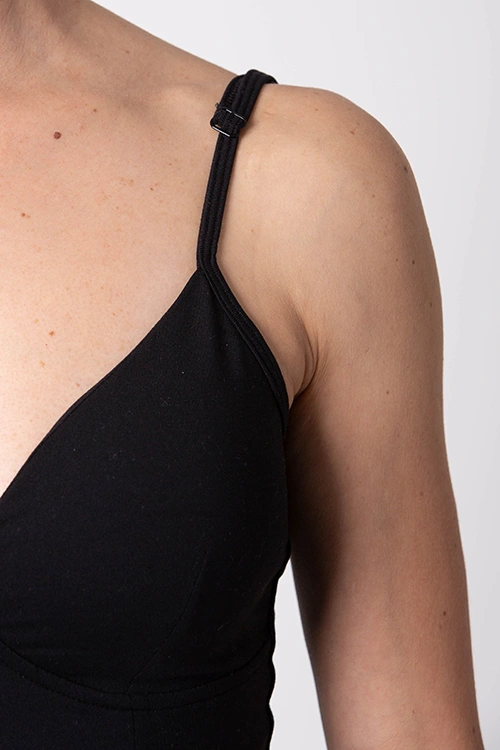 O Macacão Poise foi criado em colaboração com a bailarina Inês Jacques, fundadora do estúdio Ballerina Body, pensado para acompanhar cada movimento com elegância e funcionalidade. Confeccionado em preto clássico, apresenta um detalhe que acentua a cintura, valorizando a silhueta. O decote em V é sofisticado, com copas integradas e removíveis para maior versatilidade. As alças ajustáveis e o design de costas abertas proporcionam um toque delicado e feminino.