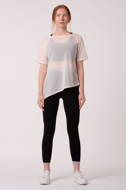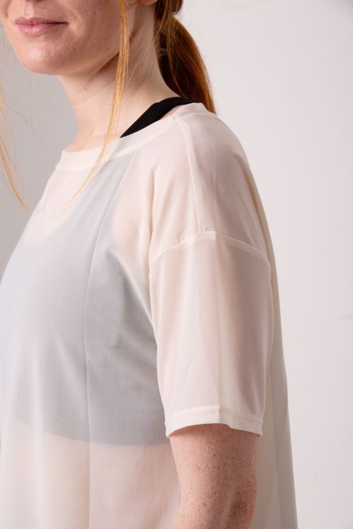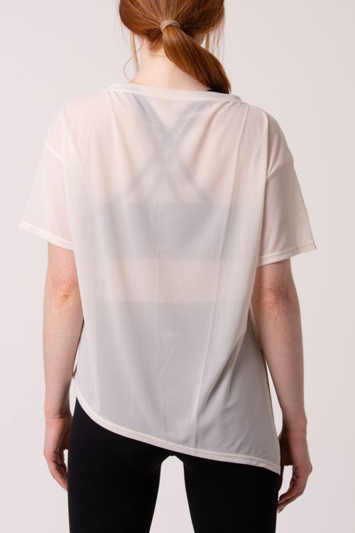 Esta t-shirt combina um tecido translúcido e respirável com um estilo lindo e relaxado, proporcionando conforto e um visual elegante.