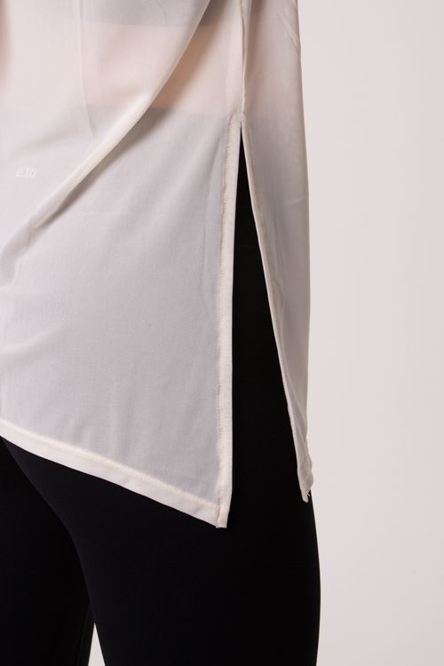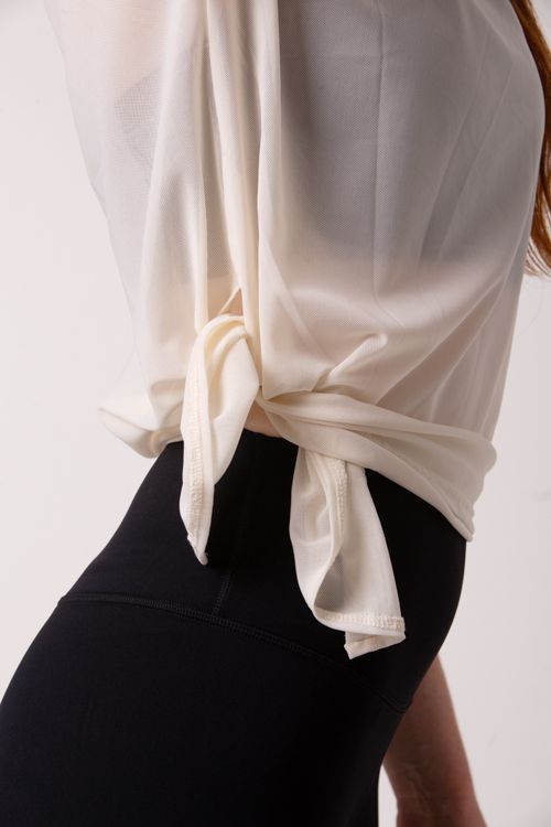 A T-shirt Refresh é confeccionada com um tecido translúcido, que oferece um toque suave e uma sensação leve na pele. Esse tecido permite que o ar circule livremente, proporcionando uma sensação refrescante durante todo o dia. Além disso, sua natureza respirável ajuda a afastar a umidade, a te manter seca e confortável, mesmo em dias mais quentes. Ela veste solta, proporcionando uma sensação de liberdade e fluidez ao se movimentar. No entanto, ela também possui a opção de ajuste, com um detalhe de amarração ao costado. Isso permite que personalizes o caimento da t-shirt, criando um visual mais ajustado e definido, se desejas.